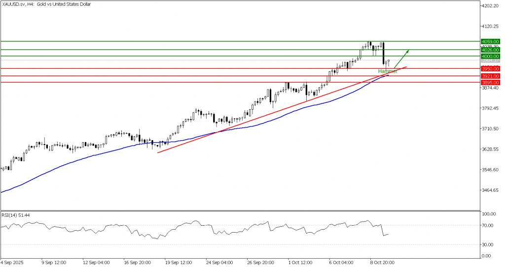 Pergerakan emas di time frame H4 masih berada dalam tren naik, terlihat dari garis uptrend line yang tetap terjaga dan posisi harga yang bergerak di atas SMA 50. Setelah menyentuh resistance 4.059, tekanan jual muncul dan mendorong harga turun hingga area support 3.950. Koreksi ini membentuk candlestick hammer karena buyer kembali mengambil alih kendali saat harga mendekati MA dan zona demand.
