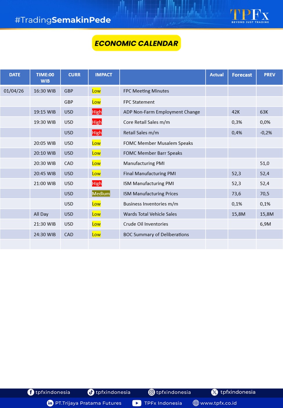 Dari sisi fundamental pada 1 April 2026, rilis data AS seperti ADP Employment Change, Retail Sales, dan ISM Manufacturing PMI berpotensi memperkuat USD jika hasilnya positif, sementara dari Kanada terdapat BoC Summary of Deliberations yang dapat memberikan tekanan tambahan pada CAD jika bernada dovish.