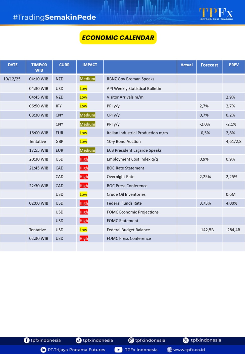 Di sisi lain, USD sedang berada dalam tekanan karena ekspektasi pasar bahwa The Fed dapat kembali memangkas suku bunga pada Kamis 11 Desember jam 02.00 wib, sehingga bias dasar USD masih cenderung melemah. Kombinasi ini menciptakan skenario fundamental yang lebih condong ke penurunan USDCAD, kecuali BoC tiba-tiba menjadi dovish.