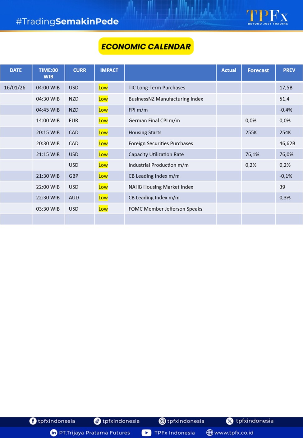 Dari sisi sentimen, melemahnya permintaan safe-haven juga dipengaruhi oleh pernyataan Presiden AS Donald Trump yang mengambil nada lebih moderat terkait situasi di Iran. Trump menyampaikan bahwa eskalasi kekerasan di negara tersebut tampak mereda dan belum ada rencana intervensi besar, sehingga ketegangan geopolitik yang sebelumnya menopang harga emas sedikit berkurang. Selain itu, Trump menegaskan belum berencana memecat Ketua The Fed Jerome Powell, meskipun terdapat tekanan politik terkait kebijakan suku bunga, yang turut membantu menenangkan pasar.