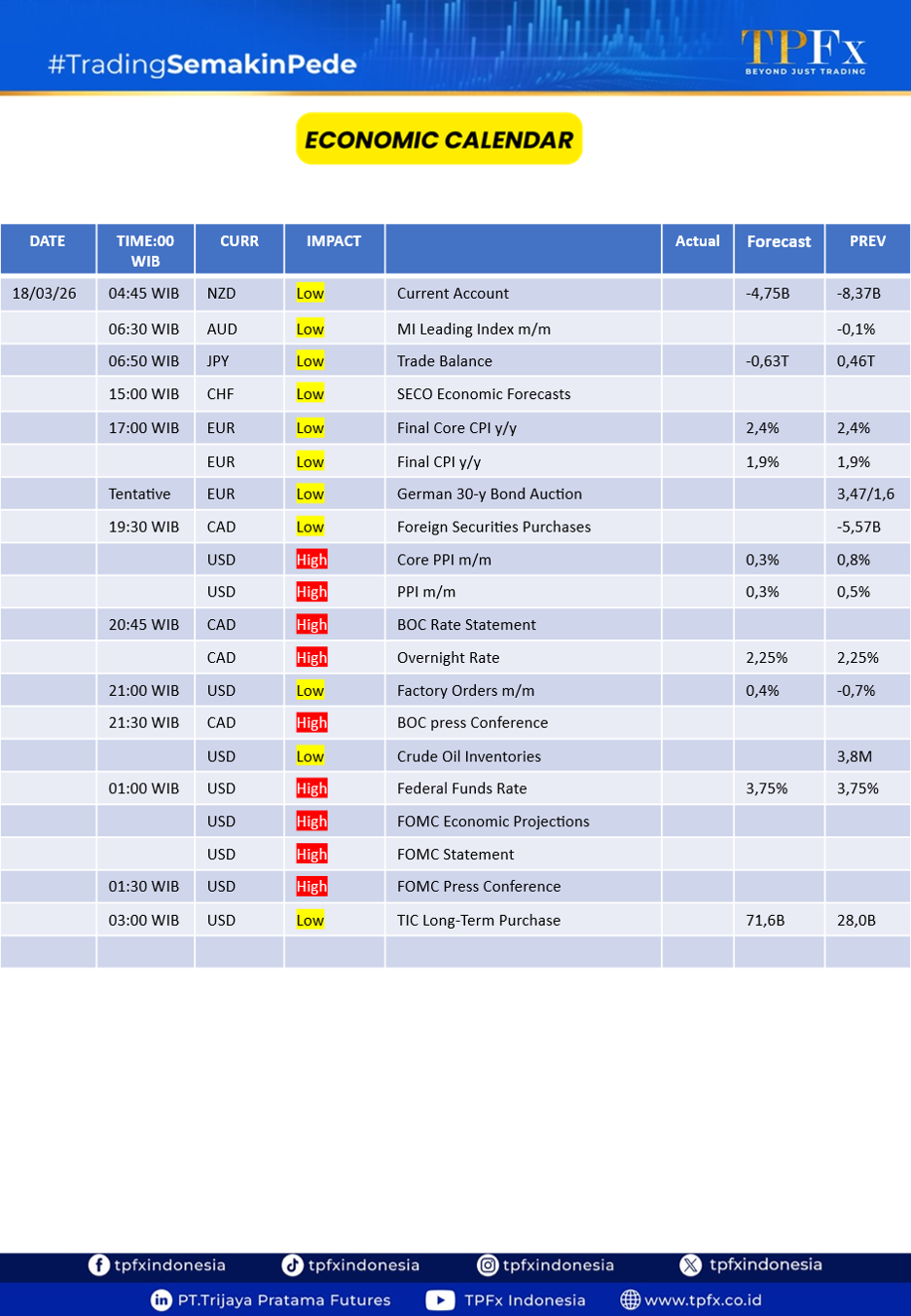 USDCAD pada H4, struktur harga menunjukkan pergeseran dari bearish ke bullish setelah terjadi break struktur dan pembentukan higher low di area 1.35800–1.36000. Saat ini harga berada di sekitar pivot 1.36961 dan cenderung melakukan pullback ringan dalam tren naik. Selama harga mampu bertahan di atas support 1.36701, bias masih bullish dengan potensi kenaikan menuju 1.37152, 1.37412 hingga 1.37603. Namun jika breakdown di bawah 1.36510, maka struktur bullish berpotensi gagal dan harga bisa kembali melemah. Dari sisi fundamental, pergerakan USDCAD pada 18 Maret 2026 dipengaruhi oleh ekspektasi kebijakan The Fed, rilis data PPI AS, serta kenaikan harga minyak akibat konflik geopolitik yang cenderung memperkuat CAD. Kondisi ini membuat USDCAD berpotensi bergerak volatil dan cenderung sideways.