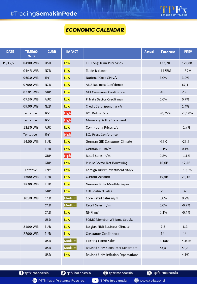 Pelemahan mata uang Yen terhadap mata uang Dollar AS kembali melanda pergerakan mata uang Jepang tersebut. Kondisi tersebut memperpanjang kerugian dari sesi sebelumnya karena kekhawatiran atas memburuknya prospek fiskal Jepang membebani mata uang tersebut. Tekanan meningkat setelah Perdana Menteri Sanae Takaichi menegaskan kembali rencana pengeluaran fiskal proaktif yang bertujuan untuk mendukung pertumbuhan dan meningkatkan pendapatan pajak, sehingga menimbulkan kekhawatiran akan semakin meningkatnya tekanan pada keuangan publik. Perhatian juga tertuju pada Bank Sentral Jepang, yang memulai pertemuan kebijakan selama dua hari dan secara luas diperkirakan akan menaikkan suku bunga kebijakannya sebesar 25 basis poin menjadi 0,75% karena tingginya biaya pangan membuat inflasi tetap di atas target 2% bank sentral. Pasar akan memantau dengan cermat pernyataan Gubernur Kazuo Ueda setelah pertemuan untuk mendapatkan panduan mengenai prospek kebijakan tahun depan, di tengah spekulasi bahwa suku bunga dapat naik menjadi 1% pada bulan Juli. Secara eksternal, Yen juga melemah terhadap Dollar AS menjelang data inflasi AS yang penting, sementara para pejabat Federal Reserve masih terpecah pendapat mengenai ruang lingkup pemangkasan suku bunga lebih lanjut tahun depan.