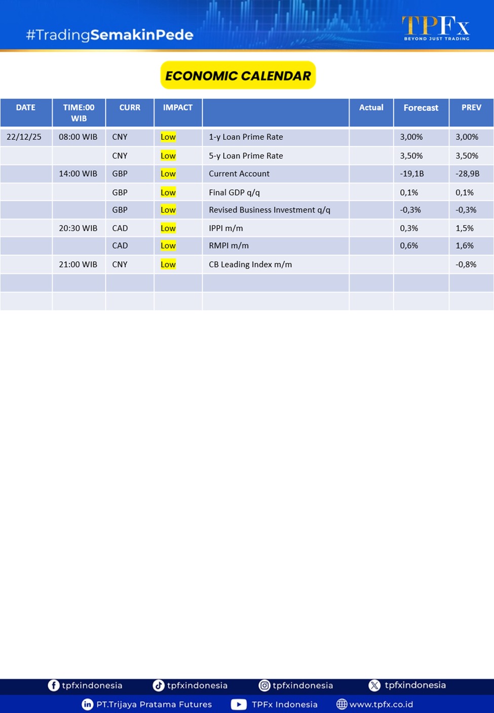 Meski BOJ sesuai espektasi menaikan suku bunga 25 bps, namun mata uang Yen Jepang melemah terhadap mata uang Greenback. Bahkan Yen mendekati level terendah 4 minggu setelah Gubernur Bank Sentral Jepang Kazuo Ueda menahan diri untuk tidak memberikan sinyal jalur yang jelas untuk kenaikan suku bunga lebih lanjut, dan menekankan fleksibilitas untuk menanggapi perkembangan ekonomi dan keuangan di masa mendatang. Ueda juga mencatat adanya ketidakpastian yang berkelanjutan seputar suku bunga netral, yaitu tingkat di mana kebijakan moneter tidak merangsang maupun menghambat aktivitas ekonomi. Gubernur menambahkan bahwa BOJ terus menjalin komunikasi erat dengan pemerintah di tengah kekhawatiran atas preferensi Perdana Menteri Sanae Takaichi terhadap kebijakan moneter yang lebih longgar. Sebelumnya, bank sentral menaikkan suku bunga acuan sebesar 25 basis poin menjadi 0,75%, seperti yang diperkirakan secara luas, menandai level tertinggi sejak 1995 karena inflasi tetap di atas target untuk jangka waktu yang lama. Inflasi utama Jepang sedikit menurun menjadi 2,9% pada November dari 3% pada Oktober, tetapi tetap di atas target BOJ sebesar 2% untuk bulan ke-44 berturut-turut, sementara inflasi inti tetap stabil di 3%.