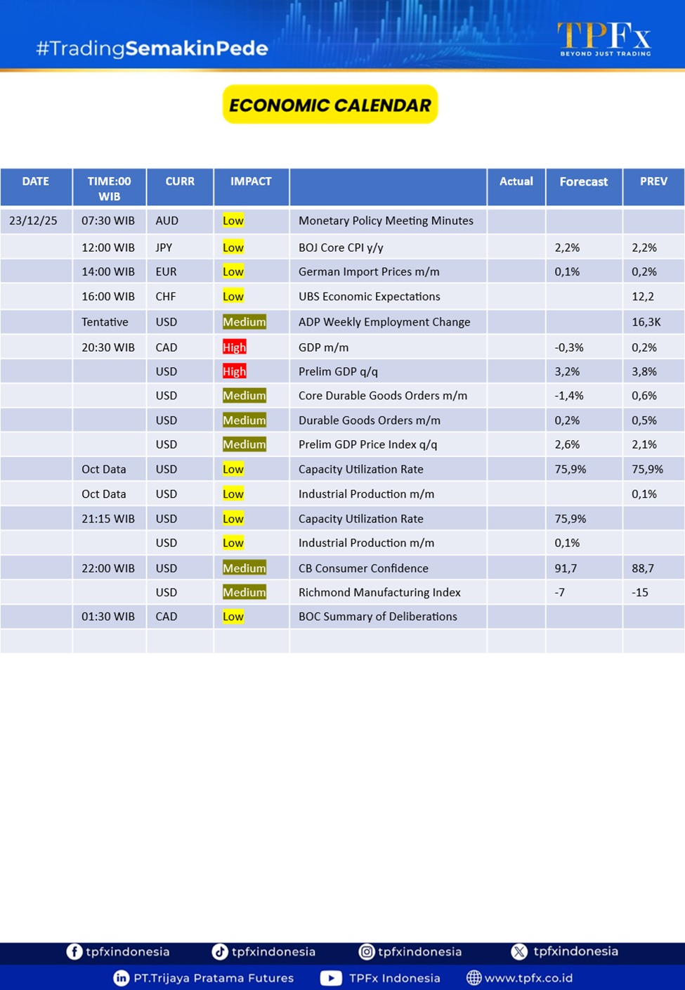 Dari sisi fundamental, fokus pasar hari ini tertuju pada rilis data Amerika Serikat, terutama Durable Goods Orders dan data pendukung pertumbuhan ekonomi yang berpotensi memicu volatilitas USD. Dari Kanada, pasar menanti data GDP bulanan, yang dapat memengaruhi CAD terutama jika terjadi deviasi signifikan dari ekspektasi. Di tengah likuiditas yang mulai menipis menjelang libur akhir tahun, reaksi harga berpotensi lebih tajam dari biasanya.