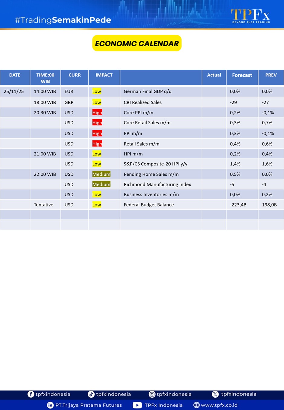 Tidak ada data ekonomi Canada yang akan dirilis malam ini, namun tersedia data Amerika yang akan rilis pada 25 November meliputi Retail Sales, PPI, Home Price Index, dan pending home sales. Data-data ini berpotensi meningkatkan volatilitas USD. Data yang lebih kuat biasanya mendorong penguatan USD, sehingga dapat menghadirkan dominasi bullish pada USDCAD, sementara data yang lemah dapat melemahkan USD dan menghadirkan dominasi bearish pada USDCAD.