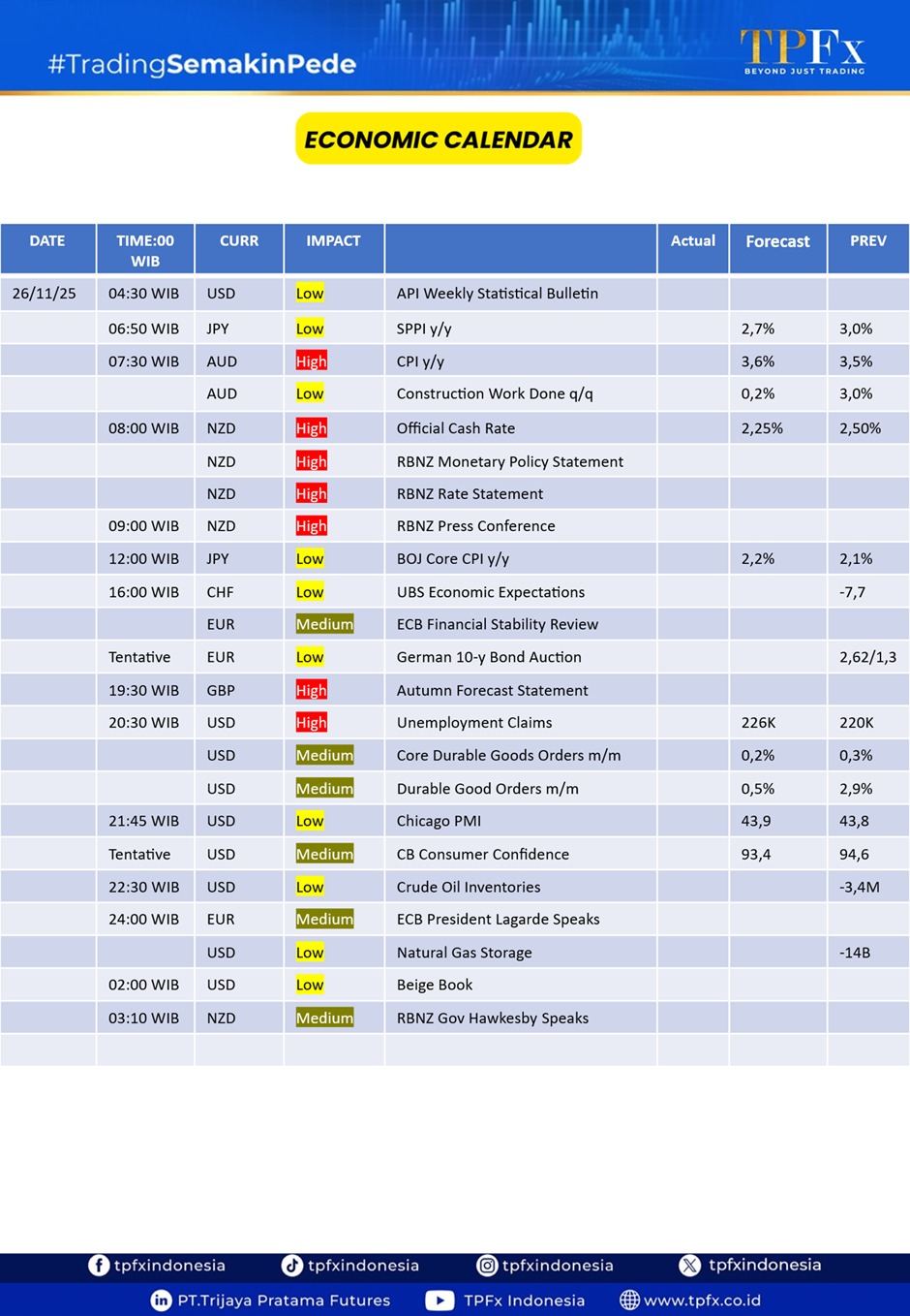 Tekanan mulai nampak pada mata uang Dollar AS terhadap beberapa mata uang utama dunia lainnya, sehingga pelemahan mulai terjadi. Terlihat pada Indeks Dollar AS (DXY) mulai merosot ke level 99,654. Hal tersebut karena meningkatnya ekspektasi bahwa Federal Reserve akan memangkas suku bunga pada bulan Desember. Keyakinan menguat setelah Gubernur Fed Christopher Waller mengisyaratkan dukungan untuk pemangkasan suku bunga, menggemakan komentar dari Presiden Fed New York John Williams dan Presiden Fed San Francisco Mary Daly, yang juga melihat pemangkasan dalam jangka pendek sebagai kemungkinan. Dengan laporan ekonomi utama yang tertunda akibat penutupan AS, pasar mengandalkan data lama, dan pasar uang sekarang menetapkan probabilitas lebih dari 80% untuk pemangkasan pada bulan Desember. Angka terkini menunjukkan aktivitas konsumen melambat: penjualan eceran hanya naik 0,2% pada bulan September setelah bulan Agustus yang lebih kuat, menunjukkan pengeluaran sedang menurun. Inflasi grosir menguat karena indeks harga produsen naik 0,3%, didorong oleh biaya energi dan pangan. Para investor kini menantikan data Durable Goods Orders/barang tahan lama bulan September dan Unemployment Claims/klaim pengangguran malam ini.