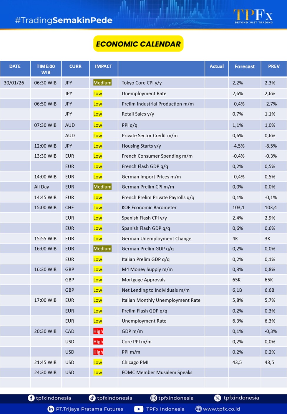 Ternyata penguatan mata uang Greenback terhadap beberapa mata uang utama dunia lainnya pada perdagangan market kemarin tidak berlanjut. Tercermin dari Indeks Dollar AS (DXY) yang kembali merosot dan sentuh level 96,016. Hal ini menggambarkan Dollar AS mengurangi keuntungan dari sesi sebelumnya karena dorongan dari penegasan kembali kebijakan Dollar AS yang kuat oleh Menteri Keuangan Scott Bessent terbukti berumur pendek. Bessent menepis spekulasi tentang intervensi AS untuk menjual Dollar AS terhadap Yen, berbeda dengan indikasi Presiden Donald Trump bahwa pemerintah merasa nyaman dengan dolar AS yang lebih lemah. Aksi jual besar-besaran terhadap aset riil juga menekan mata uang, dengan harga emas, perak, dan tembaga melonjak ke rekor tertinggi baru karena risiko geopolitik dan perdagangan, bersama dengan ketidakpastian kebijakan di Washington, melemahkan kepercayaan terhadap mata uang cadangan dunia. Sementara itu, Federal Reserve mempertahankan suku bunga tidak berubah seperti yang diperkirakan, dengan Ketua Jerome Powell mengisyaratkan bahwa bank sentral kemungkinan akan tetap mempertahankan suku bunga saat ini untuk beberapa waktu. The Fed mencatat bahwa aktivitas ekonomi terus berkembang dengan kecepatan yang solid, pengangguran menunjukkan tanda-tanda stabilisasi, dan inflasi tetap agak tinggi.