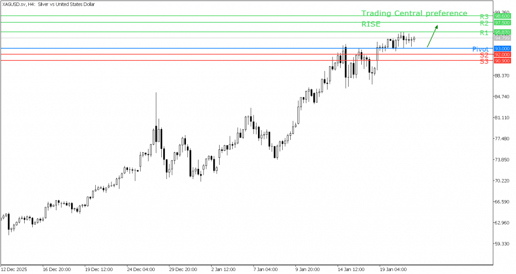 Sebagai skenario alternatif, Trading Central menilai bahwa apabila harga turun dan menembus di bawah level 93,00, maka tekanan jual berpotensi berlanjut hingga menguji area support di kisaran 92,00–90,90.