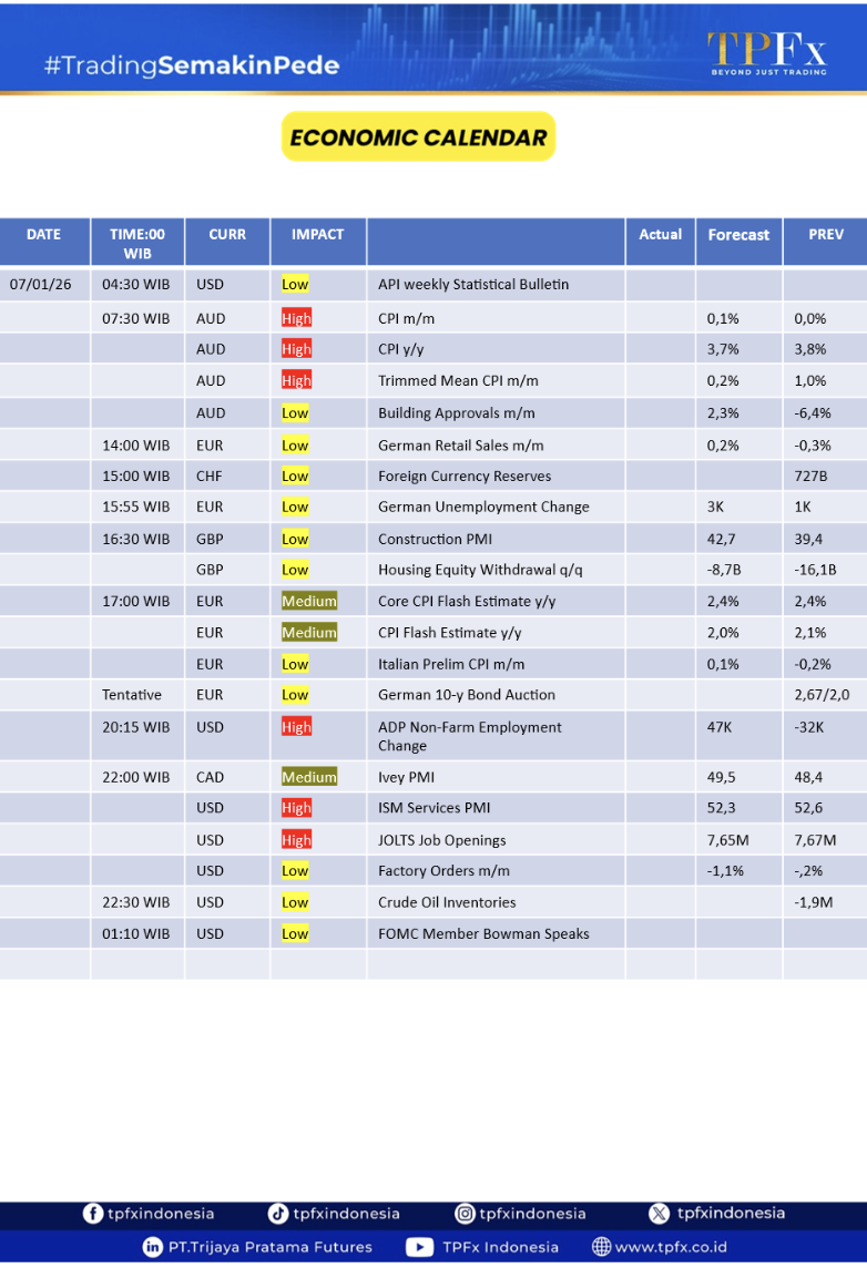 Fokus fundamental hari ini tertuju pada rilis data ekonomi Amerika Serikat, khususnya ISM Services PMI, ADP dan JOLTS Job Openings. Data AS yang solid berpotensi memperkuat USD dan menjaga bias bullish USDCAD. Dari sisi Kanada, pergerakan harga minyak tetap menjadi faktor pendukung CAD.