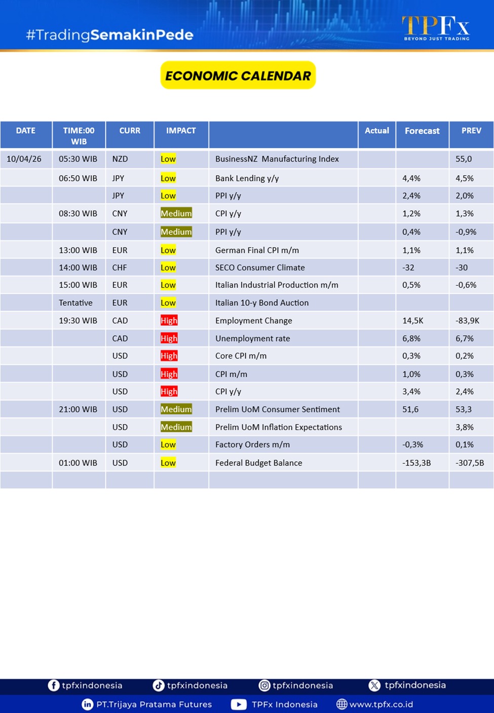 Kondisi mata uang Greenback terhadap beberapa mata uang utama dunia lainnya terus mengalami pelemahan. Terlihat dari Indeks Dollar AS (DXY) yang masih menurun dan sentuh level terendah hariannya 98,525. Pelemahan tersebut berada di dekat level terendahnya dalam sekitar satu bulan, karena berita tentang gencatan senjata selama dua minggu antara Amerika Serikat dan Iran, yang memicu penurunan tajam harga minyak, meredakan kekhawatiran investor tentang spiral inflasi dan meningkatkan ekspektasi bahwa The Fed dapat memangkas suku bunga tahun ini. Pada awal pekan, pasar memperkirakan tidak ada kemungkinan penurunan suku bunga, setelah sebelumnya mengantisipasi lebih dari dua kali penurunan sebelum konflik meningkat. Sementara itu, risalah dari pertemuan FOMC bulan Maret menunjukkan para pembuat kebijakan khawatir bahwa permusuhan di Timur Tengah dapat menyebabkan inflasi berkelanjutan yang membutuhkan kenaikan suku bunga lebih lanjut, meskipun mereka masih mengharapkan satu kali penurunan suku bunga tahun ini. Investor sekarang menunggu rilis data CPI AS bulan Maret pada hari Jumat untuk petunjuk tambahan tentang tekanan harga yang terkait dengan konflik yang sedang berlangsung.
